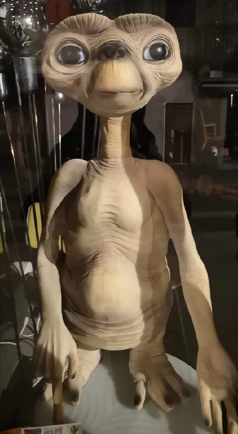 L'idea sostanziale è che questo alieno fosse piuttosto brutto quanto basso ma che non incutesse paura soprattuo nei bambini: un bipede innocuo con le braccia lunghe e dalla camminata goffa che in qualche modo doveva rinviare ad un senso di tenerezza. A questo poi aumentava di particolarità concependo il suo linguaggio telepatico e per il fatto che dai polmoni irradiasse una luce rossastra al punto di infondere guarigione ringiovanendo sino a spostare gli oggetti con la forza del pensiero. Soprattutto dopo Incontri ravvicinati del terzo tipo (1977) Spielberg stava pensando ad una continuazione quando si concentrò nella realizzazione di E.T. Fu Carlo Rambaldi a progettare gli alieni di Incontri ravvicinati del terzo tipo e fu assunto con lo scopo di dare vita a questo nuovo alieno: si ispirò all'arte concettuale per giungere al risultato di questo pupazzo meccanico il cui volto doveva ricordare Ernest Hemingway, Carl Sandburg ed Albert Einstein sino al muso di un carlino. Nella realizzazione del film le movenze del simpatico alieno erano determinate da quattro squadre tecniche che servivano effettivamente per la complessa mimica facciale mentre per i movimenti il costume era indossato da nani e da bambini per dargli così autonomia. Fu così che il film fu accolto dal pubblico positivamente tanto da farlo considerare non solo dalla critica ma rientrare nella classifica AF/'s 100 Years…100Movie Quotes per la celebre frase "Telefono casa" che è rientrata come quindicesima frase del cinema internazionale. Ecco come da una mancanza da parte di un bambino prodigio si sia nel tempo depositata nella sua mente l'idea dell'amico immaginario con cui giocava da solo nella sua cameretta divenendo poi un'entità sconosciuta che gli extraterrestri lasciano sulla Terra. Ed in età adulta sia stato in grado di descriverlo e farlo realizzare da tecnici come Rambaldi che ne hanno fatto un capolavoro di creatività ed ingegno creativo. Il piccolo alieno caduto sulla Terra è la personificazione di tanta solitudine: rappresenta E.T. la concretizzazione di tutte quelle conversazioni, di quei giochi e di quei pomeriggi infiniti nel totale isolamento di un ragazzino che sognava un proprio inserimento nel tessuto sociale. Ma Spielberg è diventato adulto e dopo anni il suo personaggio immaginifico ha preso forma. Ed eccomi tra le vie del centro addentrarmi per quei vicoli quando all'improvviso mi sono fermato innanzi a tale riproduzione.