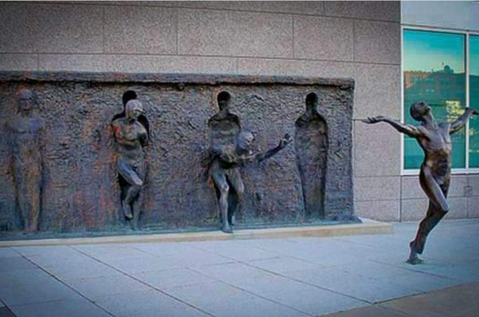 Si intitola Freedom (Libertà) la celebre scultura di Frudakis sita davanti alla SKG di Philadelphia. E' un'opera in bronzo ed è celebre per questa ventata di libertà ove una serie di figure incastonate nella parete via via si rianimano sino all'ultima che riesce a svincolarsi dal muro ossessivo di partenza per venire fuori ed alzare le braccia in senso trionfale. Mai come adesso in cui i valori e i diritti umani sono messi a dura prova dal sistema di riferimento od in un momento storico ove spiccano le contraddizioni di una società che aveva creduto nell'importanza della libertà. Ora sembra improvvisamente di svegliarsi e cadere nella trappola delle disillusioni. L'amarezza di una civiltà in declino viene sintetizzata dalla gestualità di quest'opera/manifesto che mette a confronto gli stati interiori di questi personaggi/fantocci ridotti a manichini impersonali assorbiti dall'omologazione: ognuno di essi tenta di venire fuori dalla propria configurazione ma uno solo ci riesce. Dall'altra parte invece sembra un'opera figlia della cinematografia perché ci catapulta improvvisamente nei frame di una sequenza filmica ove si assiste al divenire di un solo personaggio amorfo che tenta di svincolarsi dalla prigione in cui è stato congelato ed alla fine del suo percorso individuale riesce a trovare la via della liberazione; dal primo soggetto completamente inghiottito della parete all'ultimo invece che non solo si è liberato ma che ha trovato la forza di venirne fuori sino a quello rimasto indietro a lui prossimo che allunga un braccio chiedendogli di essere aiutato ed infine a quello a metà strada che pur essendo ancora assorbito volge lo sguardo verso colui che è prossimo alla libertà. Dunque a Philadelphia oltre alla celebre scala di Rocky ecco un esempio di opera scultorea. Lo scultore nato a San Francisco è figlio di un musicista e poeta greco ed ha iniziato a percorrere le vie dell'arte già a partire dal 1972 in compagnia del fratello maggiore. L'opera in questione è appunto una scultura in bronzo permanente che fonde l'idea di scultura ed istallazione e l'artista ha voluto consacrare questo messaggio di libertà assoluta in cui possono configurarsi i significati totali della libertà: da quella mentale a quella fisica, da quella politica a quella religiosa secondo un principio che metta in primo piano una metafora visiva per il processo di trasformazione di tutti i valori. Interessante che sia stata ottenuta da una lastra istallata a livello del suolo su un muro esterno dell'edificio pubblico mentre l'ultima figura è autonoma ed a pochi metri di distanza dalla composizione divenendo uno di noi.